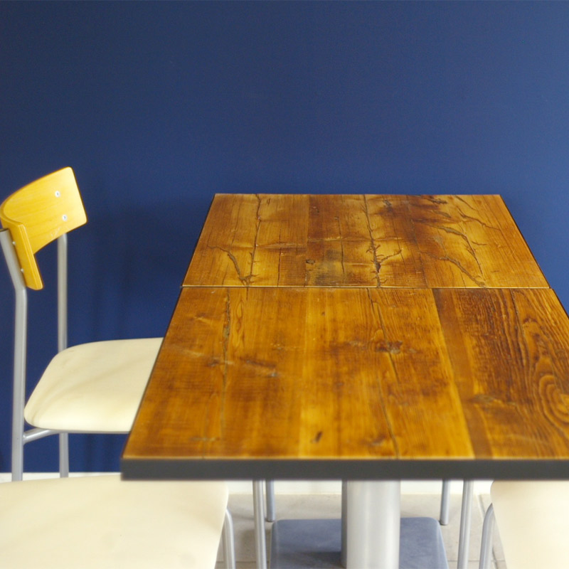 ウレタン仕上げの古材天板。アイアンの回し縁がアクセントになっています。